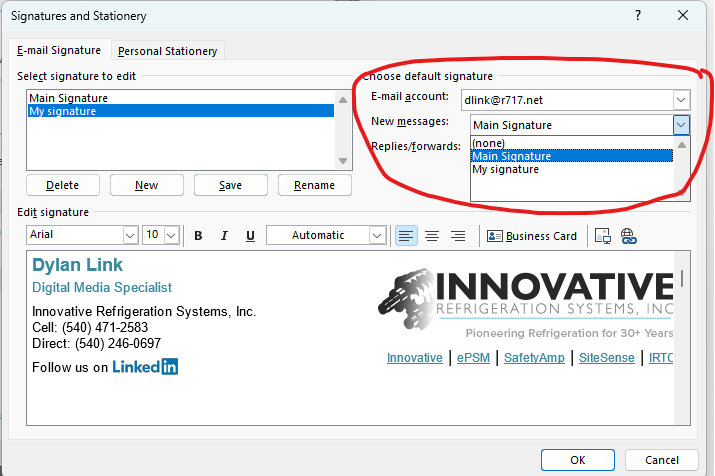 10. Before exiting, be sure to change your default signature options by clicking the dropdown menu and selecting your new signature’s name.