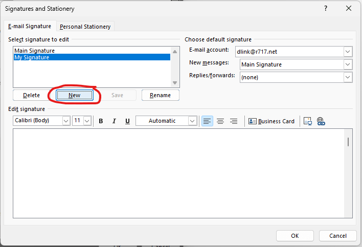 7. Click “new” to create a new signature, and name it whatever you would like.