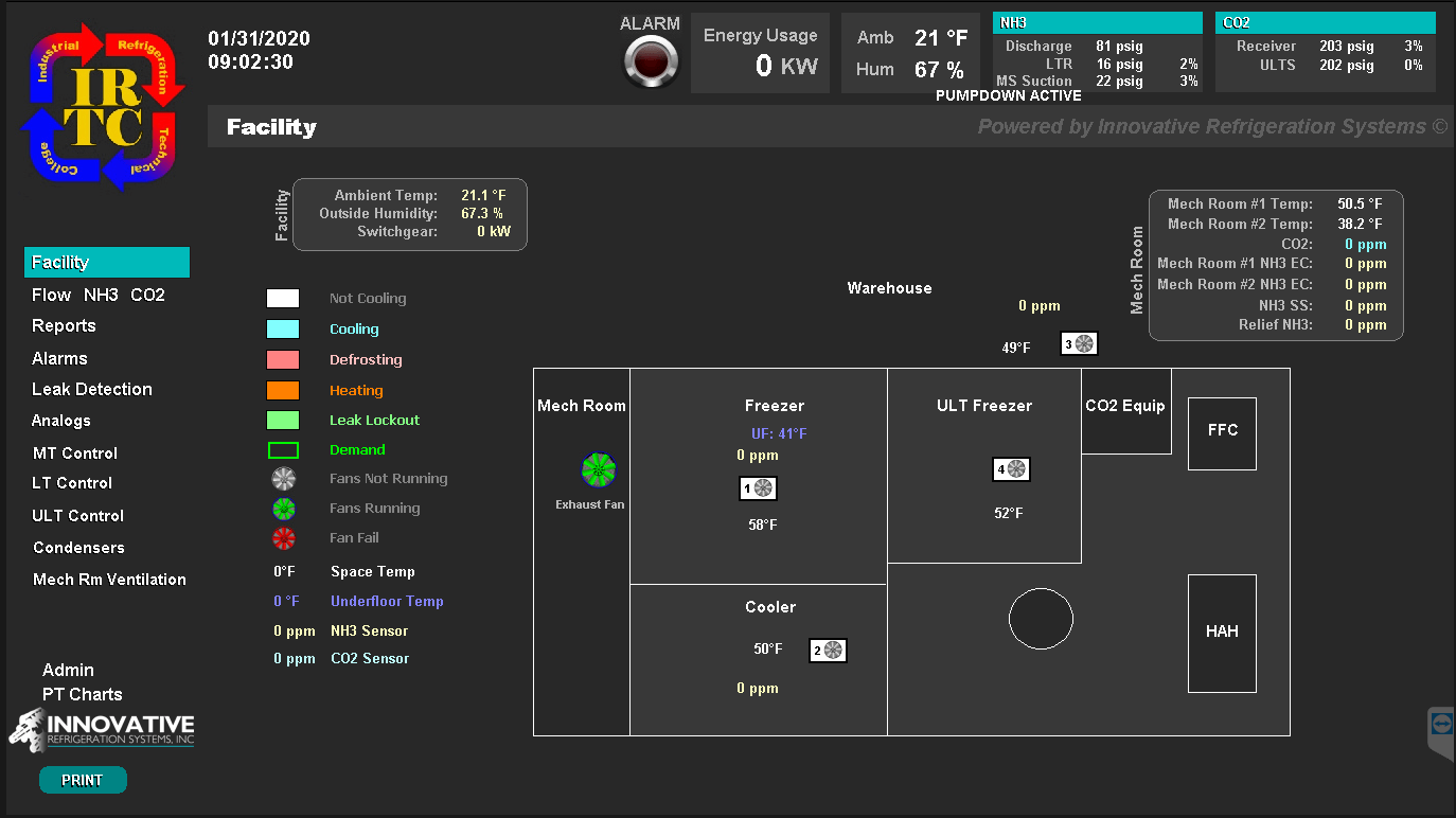 Using a modern PLC-HMI with an ammonia refrigeration system also allows real-time monitoring of performance from a remote location. In some cases, the system can even be controlled remotely; this is the technology that allows Innovative Refrigeration Systems to remotely troubleshoot systems for clients who have a service plan.